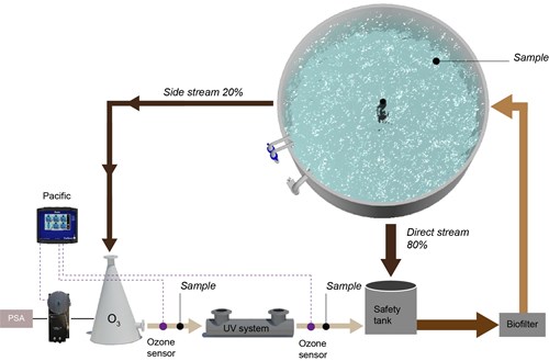 Although purging is a common practice to remove off-flavor compounds from fish flesh, it has a significant environmental impact resulting in reduced revenue. To address the issue of off-flavor compounds in RAS, which are responsible for the muddy taste and odor of fish, OxyGuard Group participated in the VIDA project (funded by the program “Value-added innovation in food chains” and supported by the EU program INNOSUP), where ozone was integrated into a commercial RAS. The ozonation was followed by a small UV system to enhance hydroxyl radical formation (Advanced Oxidation Process; AOP) and to destruct the residual ozone converting it to oxygen. Ozone sensors were used to continually measure potential residual ozone and control the ozone treatment.