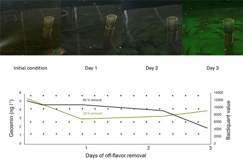 A remarkable improvement in the color due to the oxidation of humic substances was observed just after a few hours. After three days, the whole water volume in the freshwater RAS department was transparent. Although the initial geosmin content was low (~5ng/L), ozonation achieved a 60% geosmin removal in 3 days while the bacterial activity (determined by BactiQuant™, Mycometer) was reduced by 25% during the same period .